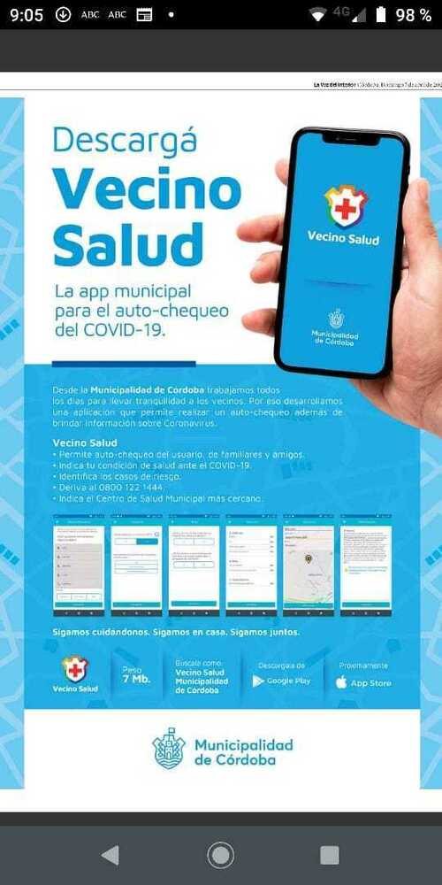 La Municipalidad de Córdoba a través de la Secretaria de Planeamiento, Modernización y Relaciones Internacionales desarrolló la aplicación “VECINO SALUD”, una herramienta digital informa a los ciudadanos de córdoba de manera oficial la situación actual del COVI-19 y permite que se realicen un auto-chequeo para saber si los síntomas que presentan son compatibles con el coronavirus.