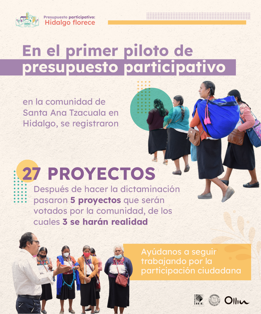 {"body":{"en":"<p>The Hidalgo Florece pilot was the first participatory budgeting (PB) exercise in Hidalgo and the first in an indigenous community. It was an exercise promoted by civil society, a process that was strengthened with the involvement of the Acaxochitlán city council, and adding other fundamental actors such as the Hidalgo State Electoral Institute (IEEH) and community representation. Through a Working Group made up of each participating institution, the pilot was designed and implemented, creating a community governance dynamic.</p><div class=\"editor-content-image\" data-image=\"\"><img src=\"https://decidim-oidp.s3.amazonaws.com/uploads/decidim/decidim_awesome/editor_image/image/1085/2DA_sesi%C3%B3n_ordinaria_22.03.2022__2_.jpeg\" alt=\"\"></div><p>The pilot consisted of the following specific actions:</p><ul><li><p>Training for institutions involved in pp matters in Mexico and the world.</p></li><li><p>Community and participatory diagnosis</p></li><li><p>Issuance of the call to present projects collectively and individually, with 27 projects received.</p></li><li><p>Carrying out 3 tours of successful PB projects (2 in Mexico City and 1 in Nuevo León), with which 72 people from the community learned about other PB models, as well as having innovative and successful project references.</p></li><li><p>Ruling with specialists and people from the community for a culturally appropriate evaluation.</p></li><li><p>The dissemination of projects was guided by guidelines issued by the working group, providing support to promoters.</p></li><li><p>Single day of voting: in this the projects in which $600,000.00 MXN were invested were decided; There were 5 participating projects, with only 3 winners, obtaining $200,000.00 MXN each, which were a reforestation of two hectares in burned and cleared areas of the community, a recreational park next to the community dam and the rehabilitation of a tennis court. soccer, projects promoted by a 13-year-old girl, a mother and a young man, respectively.</p></li><li><p>A Citizen Committee of people who voluntarily decided to get involved in monitoring and monitoring the execution of the winning projects was formed. This body, accompanied by a group of advisors, was in charge of making decisions on specific aspects in the selection and contracting of suppliers for each project. In addition, through the documentation of the exercise of the appeal shared with this body, the transparency and accountability of the process was promoted.</p></li></ul><p><br></p><p>The implementation of a PB impacted the community by transforming its perspective of participation and democracy, and changing previous patterns of participation in it. By including girls, boys, young people, people without legal residence in the community, people without an economic contribution, among others; a more inclusive participation of the entire community was achieved with higher levels of equality. A co-governance model was created where the design of the PB was collaborative and culturally appropriate, with technological innovations, which allowed the socialization of new forms of participation. The active participation of the community at all stages made it possible to consolidate their ties, since new relationships were generated within the community that allowed the planning of follow-up activities for the winning projects, a sign of community appropriation of said initiatives.</p><p><br></p><p><a href=\"https://ollinac.org/herramientas-de-la-democracia/gid://uclg/Decidim::Hashtag/33/hidalgo\" target=\"_blank\">https://ollinac.org/herramientas-de-la-democracia/gid://uclg/Decidim::Hashtag/33/hidalgo</a></p><p><a href=\"https://drive.google.com/file/d/16xNUy06VRYUhgI7Vt2kl3J4tqLoeUJNI/view?usp=share_link\" target=\"_blank\">Platform: Hidalgo Blooms</a></p><p>Currently the page is in the process of updating Citizen Lab Santa Ana Tzacuala (<a href=\"https://santaanatzacuala-hidalgo.citizenlab.co/es-CL/\" target=\"_blank\">https://santaanatzacuala-hidalgo.citizenlab.co/es-CL/</a>)</p><p><br></p>","es":"<p>El piloto Hidalgo Florece fue el primer ejercicio de presupuesto participativo (PP) en Hidalgo y el primero en una comunidad indígena. Fue un ejercicio impulsado desde la sociedad civil, proceso que se fortaleció con el involucramiento del ayuntamiento de Acaxochitlán, y sumando a otros actores fundamentales como el Instituto Estatal Electoral de Hidalgo (IEEH) y a la representación comunitaria. A través de un Grupo de Trabajo conformado por cada institución participante se diseñó e implementó el piloto creando una dinámica de gobernanza comunitaria. </p><div class=\"editor-content-image\" data-image=\"\"><img src=\"https://decidim-oidp.s3.amazonaws.com/uploads/decidim/decidim_awesome/editor_image/image/1087/2DA_sesi%C3%B3n_ordinaria_22.03.2022__2_.jpeg\" alt=\"\"></div><p>El piloto consistió en las siguientes acciones específicas:</p><ul><li><p>Capacitación a instituciones involucradas en materia de pp en México y el mundo.</p></li><li><p>Diagnóstico comunitario y participativo </p></li><li><p>Emisión de la convocatoria para presentar proyectos de manera colectiva e individual, con 27 proyectos recibidos.</p></li><li><p>Realización de 3 tours de proyectos exitosos de PP (2 en Ciudad de México y 1 en Nuevo León), con los que 72 personas de la <a href=\"https://drive.google.com/file/d/1g8732fuGOKxOf4wBspY45IvsSK0cpch8/view?usp=share_link\" target=\"_blank\">comunidad</a> conocieron otros modelos de PP, así como tener referentes novedosos y exitosos de proyectos.</p></li><li><p>Dictaminación con especialistas y personas de la comunidad para una evaluación culturalmente adecuada.</p></li><li><p>La difusión de proyectos fue guiada por lineamientos emitidos por el grupo de trabajo, dando acompañamiento a los promoventes.</p></li><li><p>Jornada única de votación: en esta se decidieron los proyectos en los que se invirtieron $600,000.00 MXN; fueron 5 proyectos pa