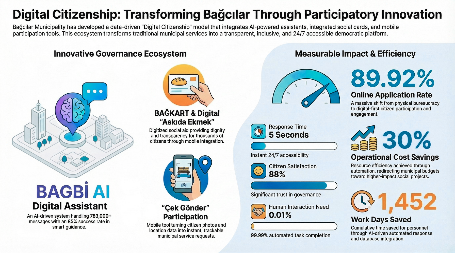 {"body":{"en":"<p>\"Digital Citizenship\" involved a paradigm shift where citizen complaints are no longer treated as mere administrative tasks, but as democratic data. This initiative dismantled the reactive, cumbersome, and paper-based bureaucratic mindset in Bağcılar—a cosmopolitan metropolitan district with a massive population density (over 32,000 people per sq. km)—and replaced it with a data-driven governance model. Built upon 25 years of Management Information System (MIS) experience, this new vision shifted city management from closed offices directly into the pockets of citizens on the ground, empowering citizens as co-governors of the city.</p><p>At the heart of the system lies the hyper-local BAĞKART, which transforms all municipal services and local economic development into a digital wallet, ensuring inclusive participation. The \"Snap & Send\" innovation directly involves the citizen as an active observer in the instant complaint process; while the data-driven \"Suspended Bread\" module ensures disadvantaged groups access basic food rights honorably. Furthermore, AI as democratic infrastructure comes to life through BAGBİ, the natural language processing (NLP) based assistant that tears down bureaucratic walls. Smart Application Management and AI have removed human contact in 99.99% of incoming applications, autonomously reducing physical waiting times from 140-210 seconds to \"Zero Wait\" (5 seconds).</p><p>This flawless data-driven structure saved Bağcılar Municipality 1,452 days of human labor, protecting the institution from inflationary risks and yielding a net cumulative saving of 1.78 Million TL. As the adoption rate of digital transaction channels reached a staggering 92.18%, satisfaction levels stabilized at 3.7/5 in monthly surveys. Digital Citizenship transforms citizen interactions into a continuous democratic feedback system.</p><p>Ultimately, the project is an exportable and scalable model of democratic urban innovation that transforms millions of digital transaction logs into the city's needs map (Decision Support System), and integrates digital and green transitions by saving 385 tons of CO2 annually. Digital Citizenship demonstrates how artificial intelligence can strengthen democracy by turning citizen voices into actionable public policy.</p><p>Learn more: <a href=\"https://ebelediye.bagcilar.bel.tr/ebelediye\"><u>https://ebelediye.bagcilar.bel.tr/ebelediye</u></a> <br><a href=\"https://ebelediye.bagcilar.bel.tr/ebelediye\"><u>https://www.oidp.net/docs/repo/doc1862.pdf</u></a></p>","es":"<p>\"Ciudadanía Digital\" implicó un cambio de paradigma en el que las quejas de los ciudadanos ya no se tratan como simples tareas administrativas, sino como datos democráticos. Esta iniciativa desmanteló la mentalidad burocrática reactiva, engorrosa y basada en papel en Bağcılar, un distrito metropolitano cosmopolita con una alta densidad de población (más de 32,000 personas por km²) y la reemplazó con un modelo de gobernanza basado en datos. Apoyada en 25 años de experiencia en Sistemas de Información de Gestión (SIG), esta nueva visión llevó la gestión urbana fuera de las oficinas administrativas y la puso directamente en manos de la ciudadanía, fortaleciéndola como co-gobernante de la ciudad.</p><p>En el corazón del sistema se encuentra el BAĞKART, que transforma todos los servicios municipales y el desarrollo económico local en una billetera digital, garantizando una participación inclusiva. La innovación \"Snap & Send\" involucra directamente al ciudadano como observador activo en el proceso de quejas instantáneas; mientras que el módulo \"Pan suspendido\" basado en datos asegura que los grupos desfavorecidos accedan a los derechos alimentarios básicos de manera honorable. Además, la IA como infraestructura democrática cobra vida a través de BAGBİ, el asistente basado en procesamiento de lenguaje natural (NLP) que derrumba las barreras <a href=\"https://ebelediye.bagcilar.bel.tr/ebelediye\">burocráticas.La</a> gestión de aplicaciones inteligentes basada en IA permite procesar el 99,99 % de las solicitudes entrantes sin intervención humana, reduciendo automáticamente los tiempos de espera presenciales de 140–210 segundos a un modelo de atención casi instantáneo (5 segundos).</p><p>Esta estructura basada en datos permitió al Municipio de Bağcılar ahorrar 1,452 días de trabajo humano, protegiendo a la institución de los riesgos inflacionarios y generando un ahorro neto acumulado de 1.78 millones de TL. Con una tasa de adopción de los canales de transacciones digitales que alcanzó un 92,18 %, el nivel de satisfacción de los usuarios se mantuvo estable en 3,7 sobre 5 en las encuestas mensuales. La Ciudadanía Digital transforma las interacciones ciudadanas en un sistema continuo de retroalimentación democrática.</p><p>Finalmente, el proyecto es un modelo exportable y escalable de innovación urbana democrática que transforma millones de registros de transacciones digitales en el mapa de necesidades de la ciudad (Sistema de Apoyo a la Decisión) e integra las transiciones digital y ecológica al ahorrar 385 toneladas de CO2 anualmente. La Ciudadanía Digital demuestra cómo la inteligencia artificial puede fortalecer la democracia al convertir las voces de los ciudadanos en políticas públicas accionables.</p><p>Más información: <a href=\"https://ebelediye.bagcilar.bel.tr/ebelediye\"><u>https://ebelediye.bagcilar.bel.tr/ebelediye</u></a> </p><p><a href=\"https://ebelediye.bagcilar.bel.tr/ebelediye\"><u>https://www.oidp.net/docs/repo/doc1862.pdf</u></a> </p>","fr":"<p>\"Citoyenneté numérique\" a impliqué un changement de paradigme où les plaintes des citoyens ne sont plus considérées comme de simples tâches administratives, mais comme des données démocratiques. Cette initiative a démantelé la mentalité bureaucratique réactive, lourde et basée sur le papier à Bağcılar — un district métropol