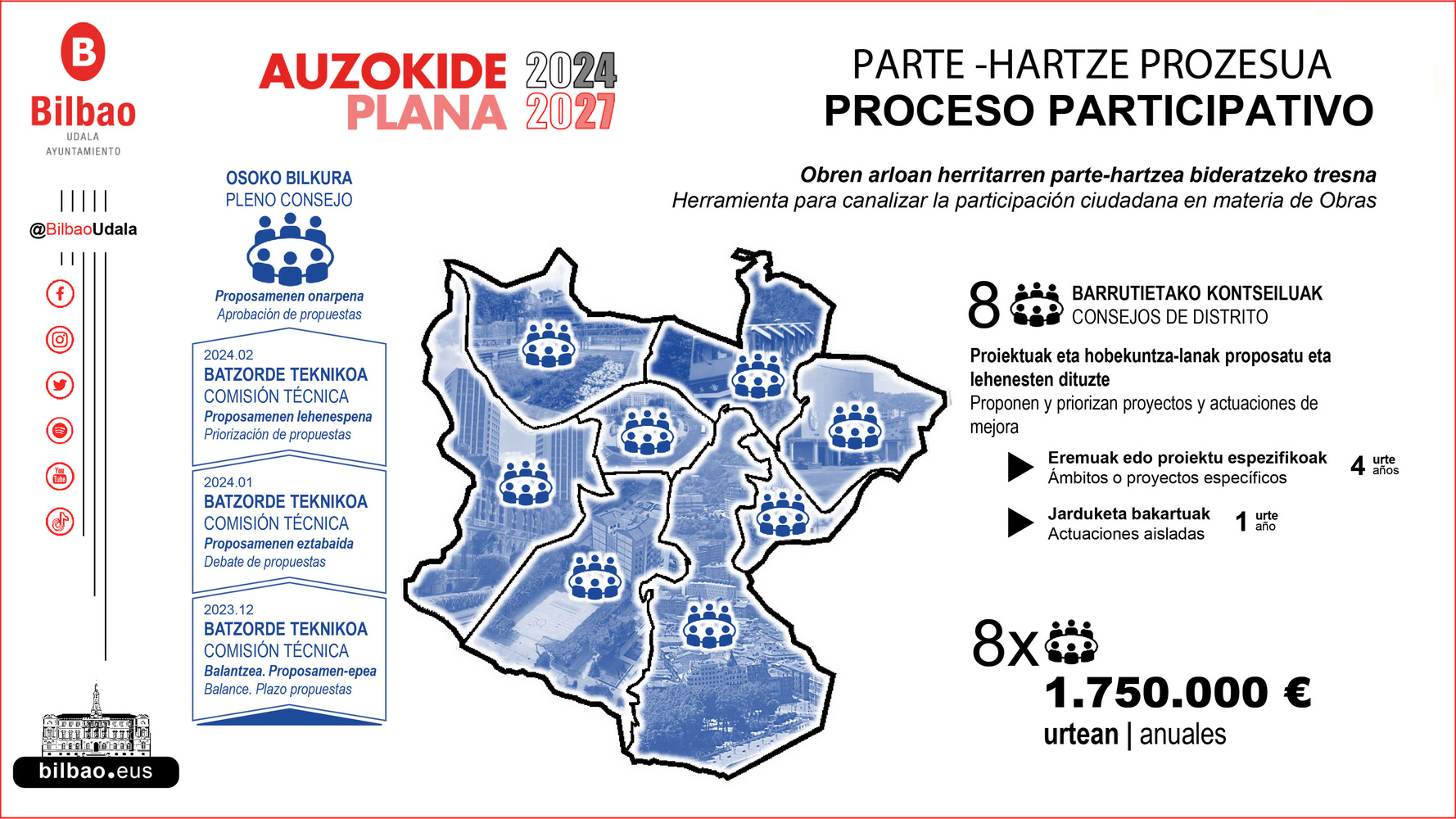 {"body":{"en":"<p>The Auzokide Plan is a municipal participation and active listening tool that allows the residents of Bilbao to propose, discuss, and prioritize urban improvements in their neighborhoods. With a duration of four years per municipal term, it addresses the challenge of integrating the real needs of neighborhoods into municipal planning through a program that seeks political, technical, and community consensus in the definition, prioritization, and subsequent implementation of urban improvements. Residents’ proposals regarding public works and services are channeled through the city’s eight District Councils—structured and stable spaces for political, community, and social representation—thus enabling citizen involvement in decision-making processes.</p><p>The Auzokide Plan integrates multi-year projects (which require technical planning) and annual actions (smaller-scale interventions with lower budgets) within the same framework: a four-year mandate, a territorial scope (the district), a participatory structure (the Council), and an economic dimension (with an annual committed budget allocation). Through political, social, and neighborhood representation, the process gives voice to the diversity and specific needs of each neighborhood. Each participant represents a variety of groups, such as women, residents, retirees, parents from school communities, and others. The design allows any individual or organization to submit proposals and contribute to projects, while the technical process ensures that all requests are analyzed and assessed according to common criteria.</p><p>The procedure combines several phases of participation: submission of proposals, preparation of reports, committee debates, technical validation, prioritization, and approval in plenary sessions. It guarantees that any citizen proposal can be analyzed, classified, and evaluated economically and technically by the Public Works Department. The plan also includes mechanisms for evaluation, communication, and transparency, ensuring a continuous and accessible flow of information through multiple channels, as well as confidentiality criteria for working documents.</p><p>Overall, this initiative has contributed to institutionalizing democracy, participatory culture, and shared civic responsibility, giving the District Councils a stable and recognized role in municipal decision-making.</p><p>More information:<strong><br></strong><a href=\"https://www.bilbao.eus/cs/Satellite/bilbaoparticipativo/es/auzokide-plana\"><u>https://www.bilbao.eus/cs/Satellite/bilbaoparticipativo/es/auzokide-plana<br>https://www.oidp.net/docs/repo/doc1885.pdf</u></a><a href=\"https://www.oidp.net/docs/repo/doc1885.pdf\"><u><br></u></a><a href=\"https://www.bilbao.eus/cs/Satellite/bilbaoparticipativo/es/auzokide-plana\"><u>https://www.oidp.net/docs/repo/doc1886.pdf</u></a></p><p></p><div class=\"editor-content-videoEmbed\" data-video-embed=\"https://youtu.be/FPyG5xJrKV0\"><div><iframe src=\"https://www.youtube-nocookie.com/embed/FPyG5xJrKV0\" title=\"Bilbao: Auzokide Plana/ Plan Auzokide\" frameborder=\"0\" allowfullscreen=\"true\"></iframe></div></div>","es":"<p>Auzokide Plana es una herramienta municipal de participación y escucha activa que permite a los y las vecinas de Bilbao proponer, debatir y priorizar mejoras urbanas en sus barrios. Con una duración de cuatro años por mandato, aborda el reto de integrar las necesidades reales de los barrios en la planificación municipal a través de un programa que busca el consenso político, técnico y vecinal en la definición, priorización y posterior ejecución de las mejoras urbanas. Las propuestas vecinales en materia de obras y servicios se canalizan a través de cada uno de los 8 Consejos de Distrito (espacios estructurados y estables de representación política, vecinal y social) permitiendo así la implicación vecinal en la toma de decisiones.</p><p>Auzokide Plana integra ámbitos plurianuales (requieren de proyecto) y actuaciones anuales (de carácter menor y con menor presupuesto) en un mismo marco temporal (4 años de mandato), territorial (el distrito) participativo (el Consejo) y económico (cuenta con asignación presupuestaria anual comprometida) en el que a través de la representación política, social y vecinal se da voz a la diversidad y necesidades de cada barrio. Cada participante representa a muchos y variados colectivos, como lo son: mujeres, vecinos y vecinas, personas jubiladas, madres y padres de centros escolares, etc. Su diseño permite que cualquier persona o entidad pueda presentar propuestas y aportar a los proyectos, mientras que el proceso técnico asegura además que todas las solicitudes son analizadas y valoradas con criterios comunes. </p><p>El procedimiento combina distintas fases de participación: recepción de propuestas, elaboración de informes, debates en comisión, validación técnica, priorización y aprobación en Pleno, y garantiza que cualquier propuesta ciudadana pueda ser analizada, clasificada y valorada económica y técnicamente por el Área de Obras. Dispone de mecanismos de evaluación, comunicación y transparencia que aseguran un flujo constante y accesible de información a través de múltiples canales, así como criterios de confidencialidad sobre los documentos de trabajo.</p><p>Todo ello ha contribuido a institucionalizar la democracia y la cultura participativa y la corresponsabilidad ciudadana dotando a los Consejos de un papel estable y reconocido dentro de la toma de decisiones municipales.</p><p>Más información: <a href=\"https://www.bilbao.eus/cs/Satellite/bilbaoparticipativo/es/auzokide-plana\"><u>https://www.bilbao.eus/cs/Satellite/bilbaoparticipativo/es/auzokide-plana</u></a> </p><p><a href=\"https://www.bilbao.eus/cs/Satellite/bilbaoparticipativo/es/auzokide-plana\"><u>https://www.oidp.net/docs/repo/doc1885.pdf</u></a> </p><p><a href=\"https://www.bilbao.eus/cs/Satellite/bilbaoparticipativo/es/auzokid