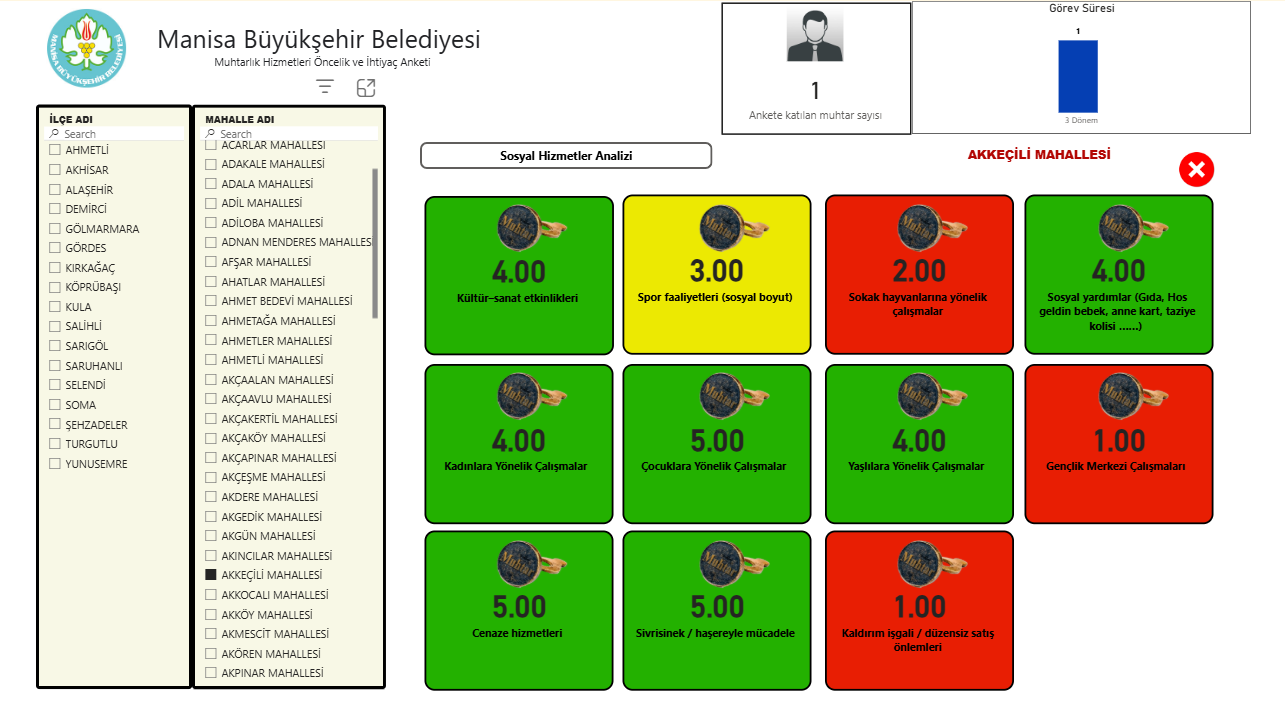 The "Neighbourhood Headmen Services Priority and Needs Survey Analysis" practice emerged from the need to identify neighbourhood level needs in Manisa in a more systematic way and to integrate this knowledge into city wide decision making processes. With a wide geographical area and neighbourhoods with diverse socioeconomic characteristics, accurately understanding local needs at the neighbourhood level has become increasingly important for effective service planning in Manisa.
